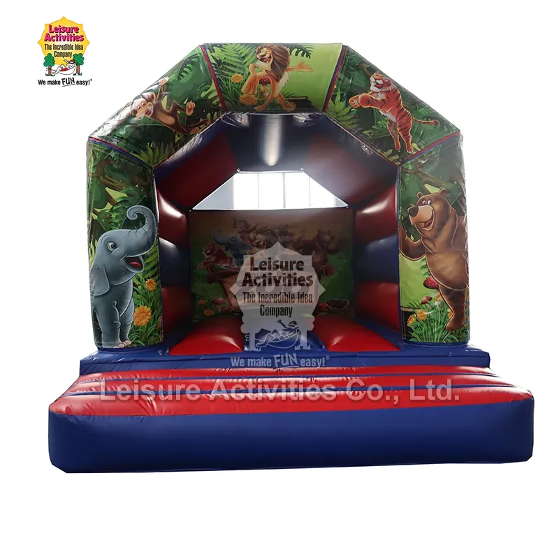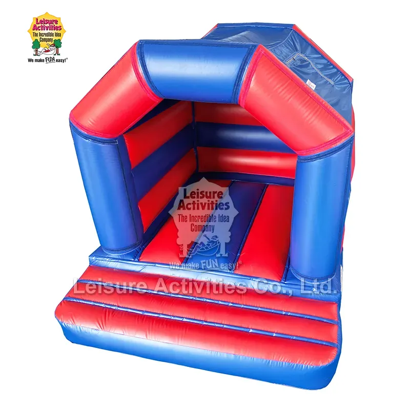 Мини замок кој се надувува, Црвена сина рамка со покрив 13ftx10ftx9ft: Овој замок на надувување Bouncy од Leisure Activities® има класичен дизајн на замок со А-рамка со црвена и сина боја. Се одликува со отстранлив панел за уметнички дела што се прикачува со велкро со кука и велкро со јамка, што овозможува лесна заменливост со различни теми како тема за еднорог, тема Зоолошка градина итн.