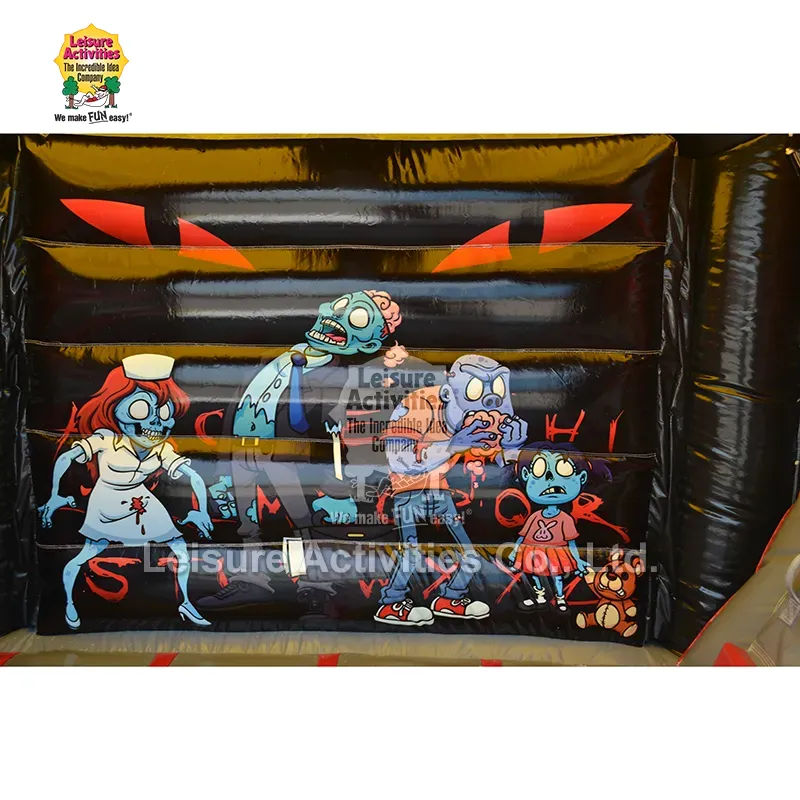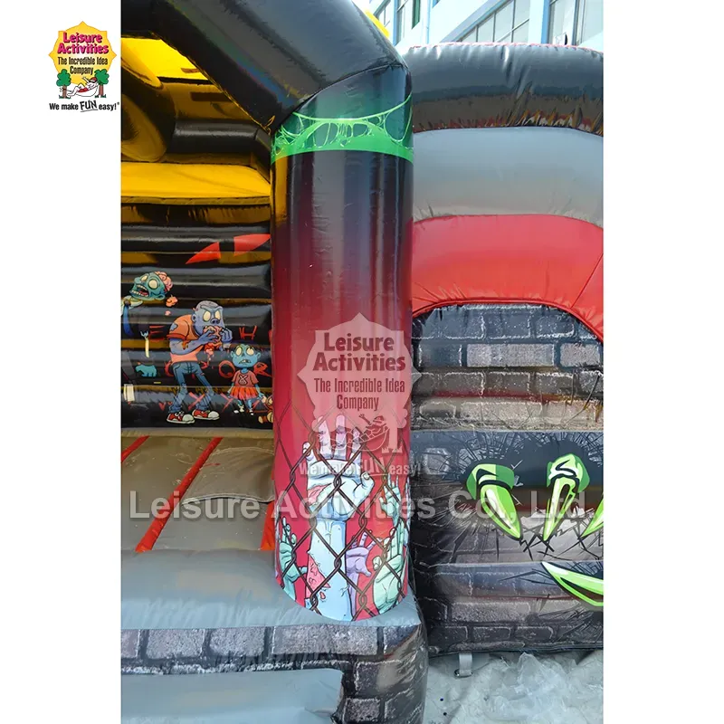 Мали надувувачки замоци кои се повеќе играни, опседнати со слајдови: оваа надувка „Haunted Combo“ со тема зомби е дизајнирана да ги плени децата со својата возбудлива естетика на цртан филм-хорор. Смелата комбинација на задебелени црвени, сјајни црни и морничави зелени и сини создаваат живописно, возбудливо опкружување. Големите, разиграни графики на зомби од цртани филмови во динамични пози - како медицинска сестра, лик што јаде мозок и дете зомби со плишано мече - се повеќе забавни отколку застрашувачки. Интерактивните елементи како големото сино зомби што ползи по покривот, рацете со канџи пробиваат низ ѕидовите и синџирите/графиките на колоните предизвикуваат имагинативна игра. Заградената структура со заштитна горна обвивка обезбедува заштита од сенка и светлина од дожд, додека затворениот тобоган придонесува за авантурата. Висината од 10 метри го прави разноврсна и за внатрешна и за надворешна употреба, совршено прилагодени за забави за Ноќта на вештерките, есенски фестивали, тематски роденденски настани и застрашувачка забава во дворот.